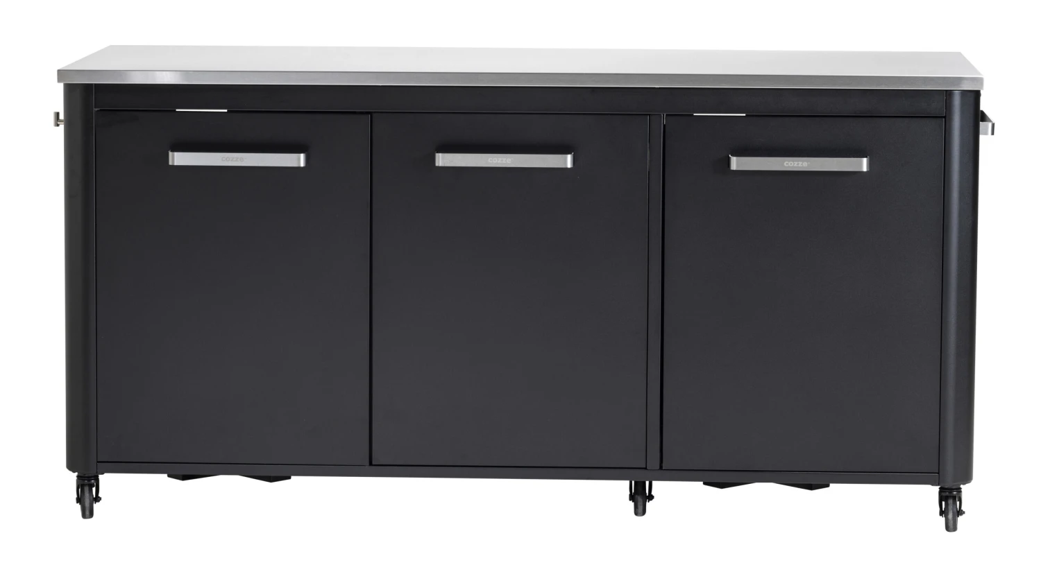 Der Cozze Outdoor Tisch besteht aus verzinktem Stahl, der schwarz lackiert ist, sowie einer rostfreien Stahlplatte für langlebige Nutzung im Wetter. Dank der sechs Räder mit Ø75 mm lässt sich der Grilltisch bei Bedarf mühelos verschieben – perfekt für flexible Nutzung im Garten oder auf der Terrasse.
