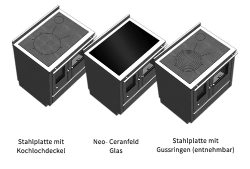 - Herdplatte wahlweise aus 8 mm Stahl oder 4 mm Ceranglas