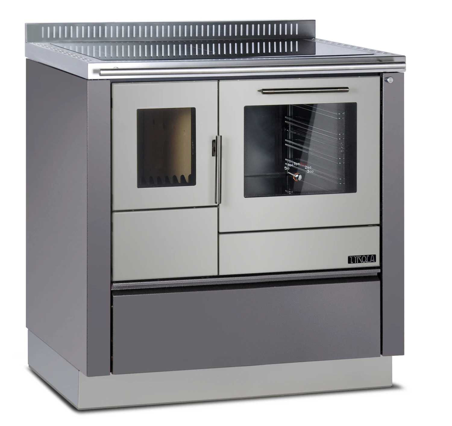 Die Leistungsfähigkeit des Holzherds wird durch seine Standardausstattung komplementiert. Brandschutzeinheiten, ein Spritzschutz, ein Edelstahlbackfach sowie Edelstahlgriffe, eine frontal angebrachte Herdstange und eine im Sockel befindliche Holzlade machen das Kochen und Backen sicher und einfach.