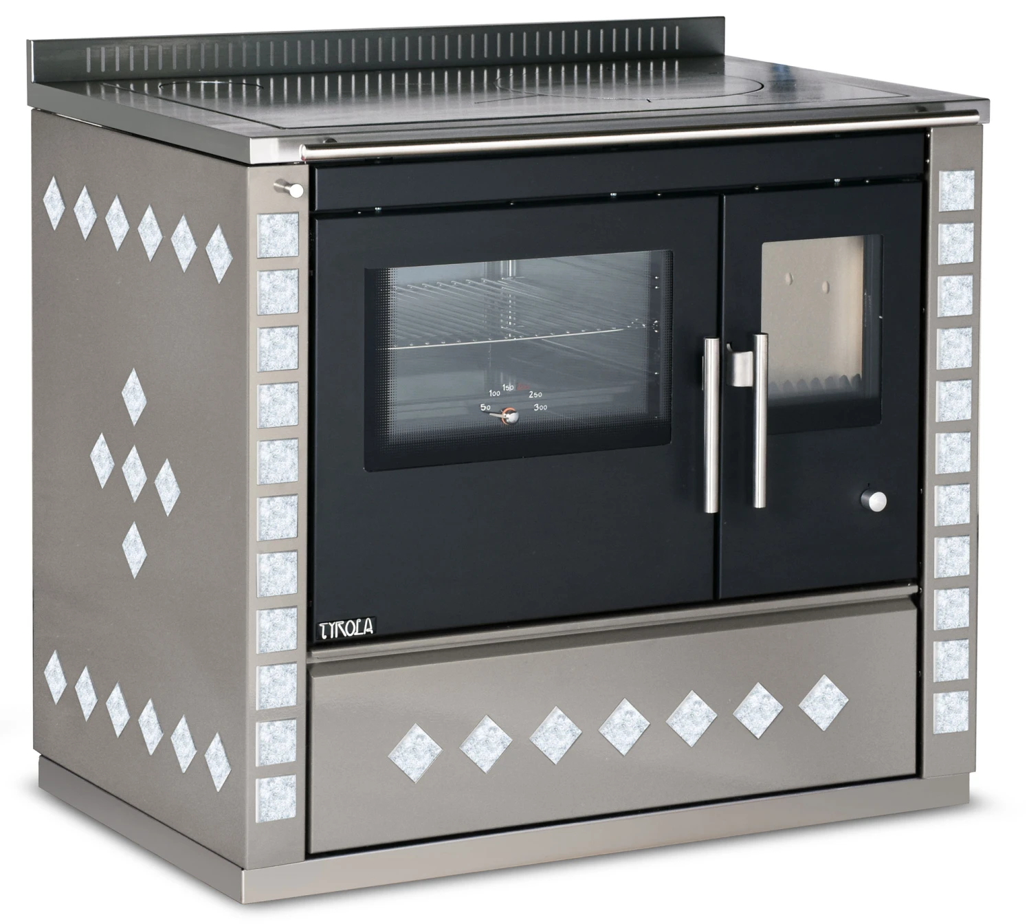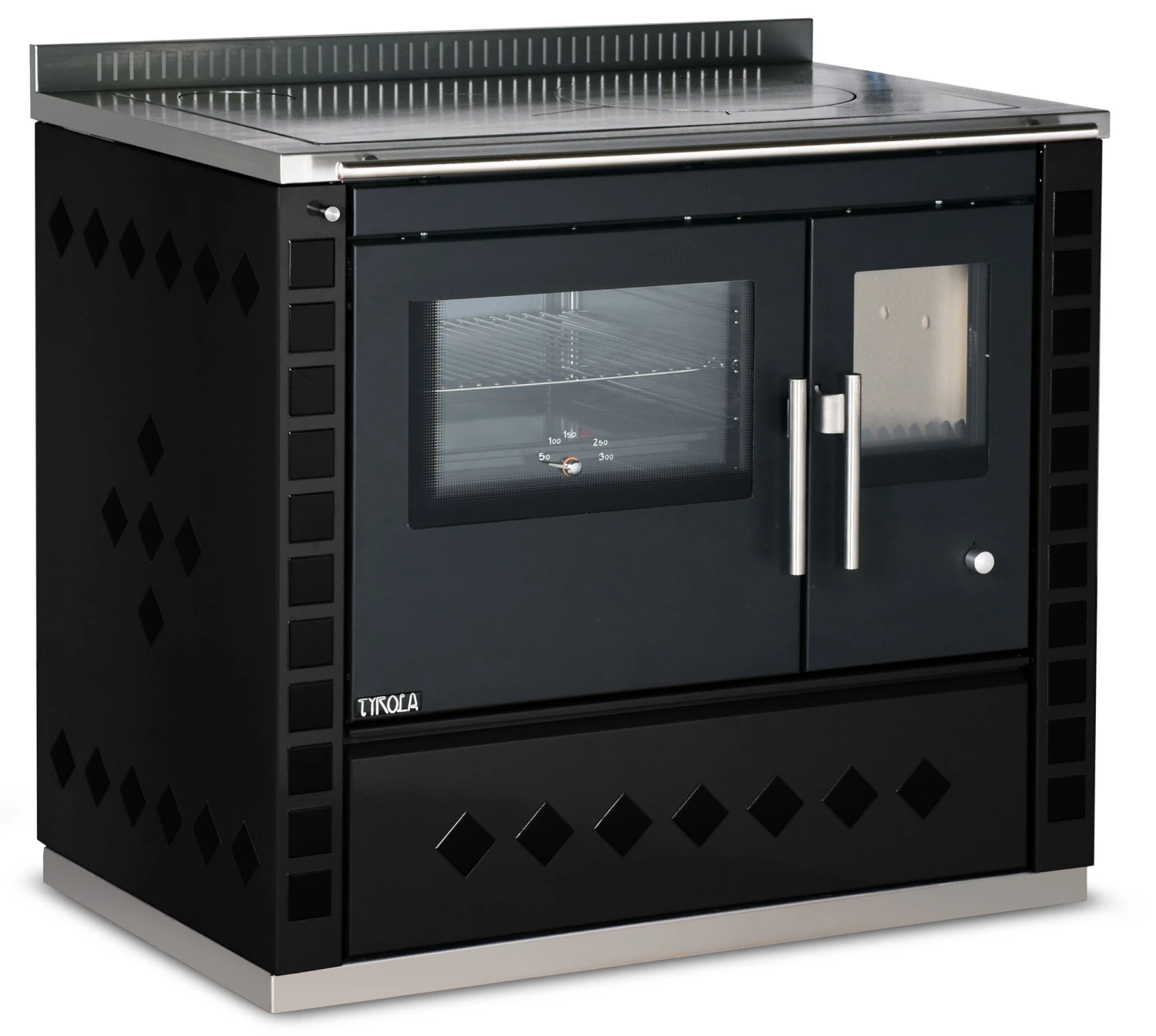 Eine qualitativ hochwertige Standardausstattung gepaart mit zahlreichen Extras, die eine Individualisierung Ihres Küchenherds ermöglichen – dafür steht die Tyrola TRC-Holzherdserie. Modernste Verbrennungstechnik sorgt für die gewünschte Leistung und eine geringe Umweltbelastung. Geliefert wird der TRC95 serienmäßig mit einem hohen Schamottanteil, der überall im Holzherd verbaut ist. Dadurch ermöglicht werden Brennraumtemperaturen von bis zu 800 °C und ein Wirkungsgrad von über 84 %. Rückstände und Abgase sind dank dieser Verbrennungstechnik sehr gering. Zur weiteren Standardausstattung gehören eine dreifach verglaste Feuerraumtür, ein Backraum aus Edelstahl mit zweifach verglaster Tür (wahlweise Flügel- oder Klapptür) sowie eine Holzlade im Sockel und eine frontal montierte Edelstahlherdstange. Die Verbrennungsluftregelung ist wahlweise automatisch oder manuell und die Herdplatte besteht entweder aus Stahl oder Ceran (bei Ceranglas und einem Rauchabgang oben wird eine minimale Fläche von dem Ceranfeld beansprucht).