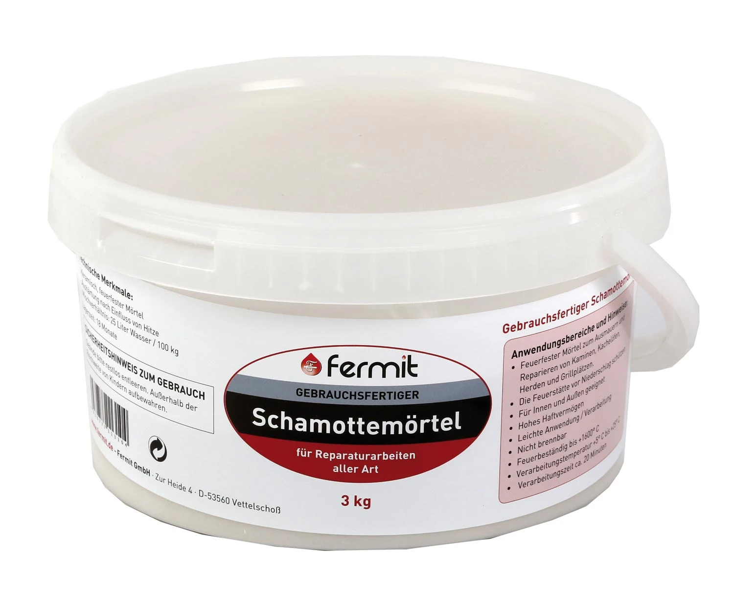 Mit diesem gebrauchsfertigen Schamottemörtel lassen sich Reparaturarbeiten aller Art erledigen. Auch das Ausmauern von Kachelöfen, Kaminen, Herden und Grillplätzen sind kein Problem. Der Mörtel ist feuerfest, bindet keramisch ab und lässt sich leicht verarbeiten.